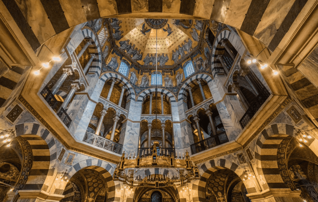 V Cáchách byla rovněž postavena první katedrála mimo území Římské říše – stavba byla inspirována katedrálou Hagia Sophia v Konstantinopoli, která byla někdejším nejbohatším městem světa.